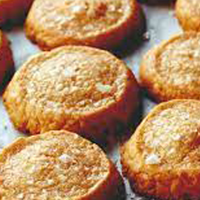 Chipotle Cheddar Cocktail Crackers – This Ina Garten “cocktail cracker” combines creamy aged cheddar and chipotle chili powder, flour and other seasonings baked and topped with flaked sea salt. Allow 2 crackers per person. 1 dozen $15